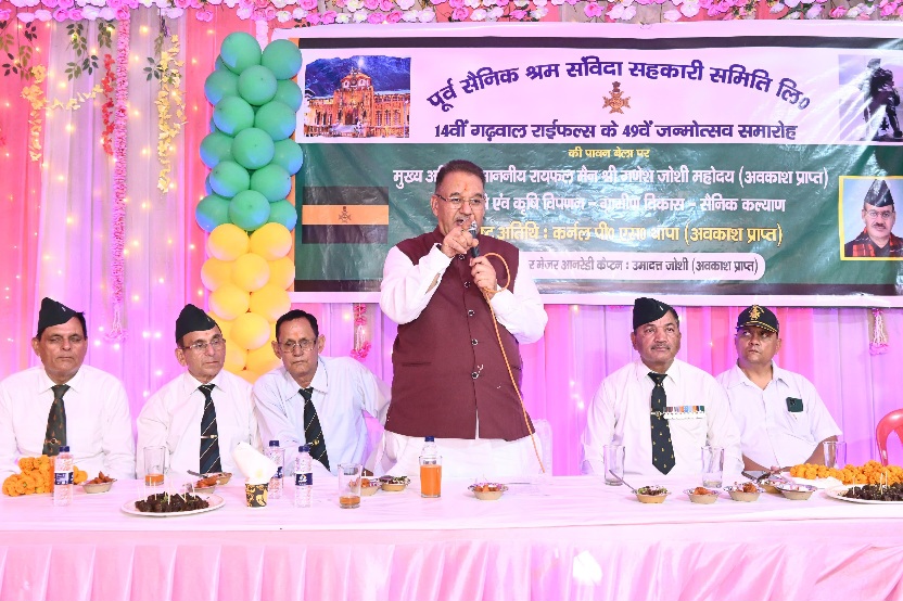 इस अवसर पर सैनिक कल्याण मंत्री गणेश जोशी ने बटालियन के पूर्व सैनिकों को स्थापना दिवस की शुभकामनाएं देते हुए कहा कि 14वीं बटालियन गढ़वाल राइफल्स में उनको सेवा करने का अवसर प्राप्त हुआ था। उन्होंने कहा कि आज मैं जहां पर भी हूं उसके पीछे मेरी सैनिक पृष्ठभूमि है। उन्होंने अपने पल्टन में बिताए पलों को भी याद किया। गढ़वाल राइफल वीरता की मिसाल है। मंत्री गणेश जोशी ने कहा कि यह वीरों की भूमि है, राष्ट्र भक्तों की भूमि है। देश की सेना का लगभग 17 प्रतिशत सैनिकों की पूर्ति उत्तराखंड जैसा कम आबादी वाला राज्य करता है। उन्होंने कहा कि प्रधानमंत्री नरेन्द्र मोदी का सैनिकों के प्रति विशेष लगाव है। वन रैंक वन पेंशन जैसे पूर्व सैनिकों की वर्षों से चली आ रही मांग को मोदी सरकार ने पूरा किया। उन्होंने कहा कि राज्य स्तर पर पूर्व सैनिकों की समस्याओं के निराकरण के लिए जनपद स्तर पर एक नोडल अधिकारी की नियुक्ति की गई है। शहीदों के परिवारों के एक सदस्य को नौकरी देने का काम भी राज्य सरकार कर रही है।
