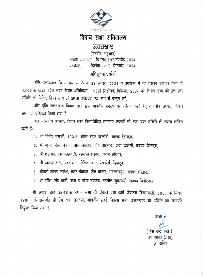 देहरादून:- सोमवार को स्पीकर ऋतु भूषण खंडूडी ने उत्तराखण्ड (उत्तर प्रदेश नगर निगम अधिनियम, 1959) (संशोधन) विधेयक 2024, के आलोक में प्रवर समिति का गठन कर दिया है। समिति एक माह मे अपना प्रतिवेदन सौंपेगी।