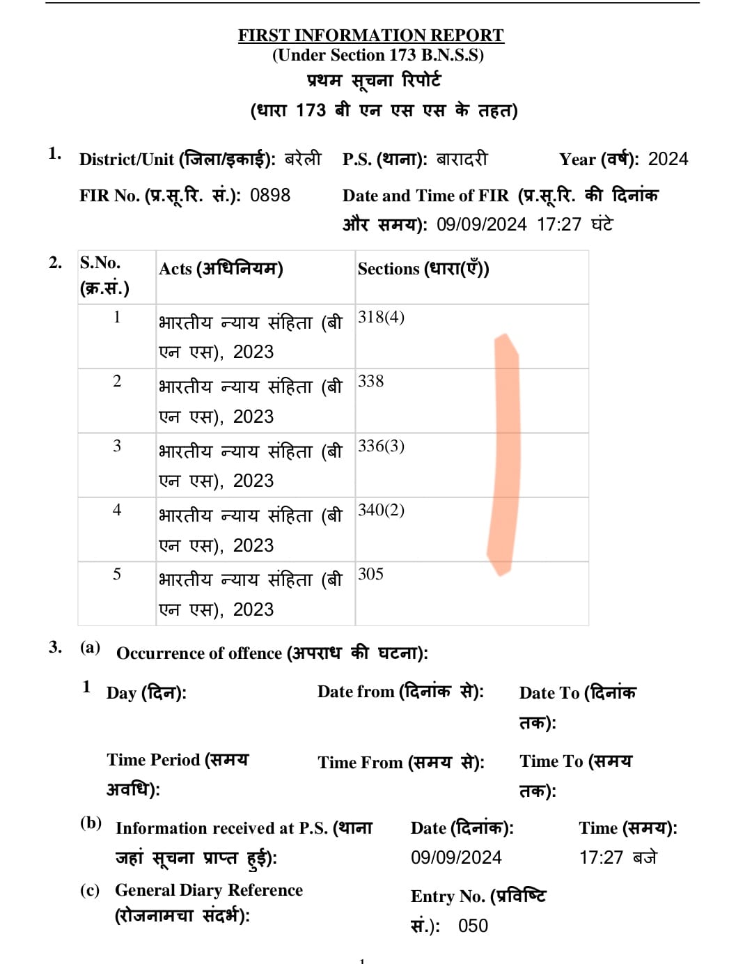 नोटः मैं हे0का0 07 राजकुमार सिंह प्रमाणित करता हूँ कि प्रा०पत्र की नकल व कायमी मेरे द्वारा शब्द व शब्द बोल बोलकर म0का0 653 आयुशी से कम्प्यूटर पर टाइप करायी गयी है। मूल प्रा०पत्र संलग्न एफआईआर है।