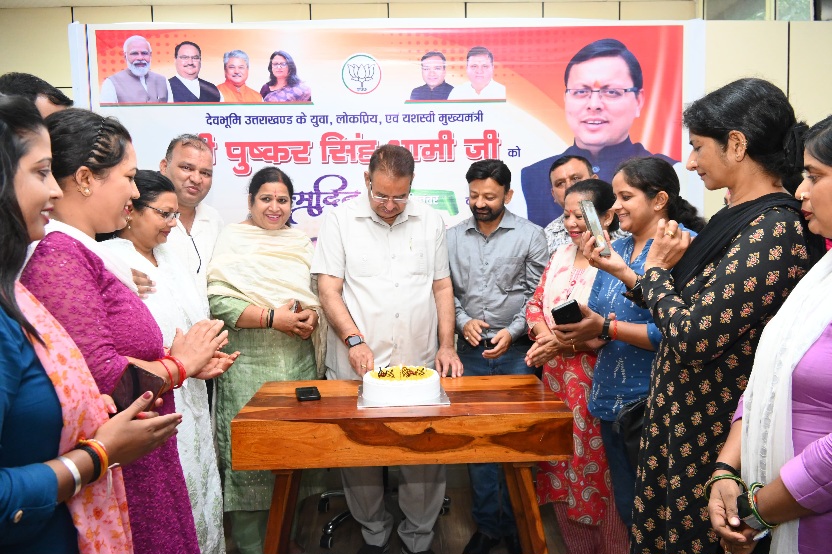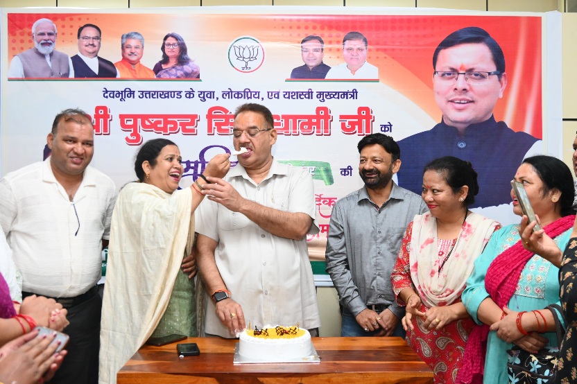 देहरादून:- कैबिनेट मंत्री गणेश जोशी ने सोमवार को कैंप कार्यालय में मुख्यमंत्री पुष्कर सिंह धामी के जन्म दिवस के अवसर पर स्थानीय लोगों और भाजपा पार्टी पदाधिकारी और कार्यकर्ताओं के साथ प्रदेश के मुख्यमंत्री पुष्कर सिंह धामी का जन्म दिवस को केक काटकर मनाया गया। इस दौरान पार्टी कार्यकर्ताओं ने एक दूसरे को केक खिलाकर मुख्यमंत्री पुष्कर सिंह धामी को जन्म दिवस की बधाई देते हुए उनकी लंबी उम्र की कामना की।