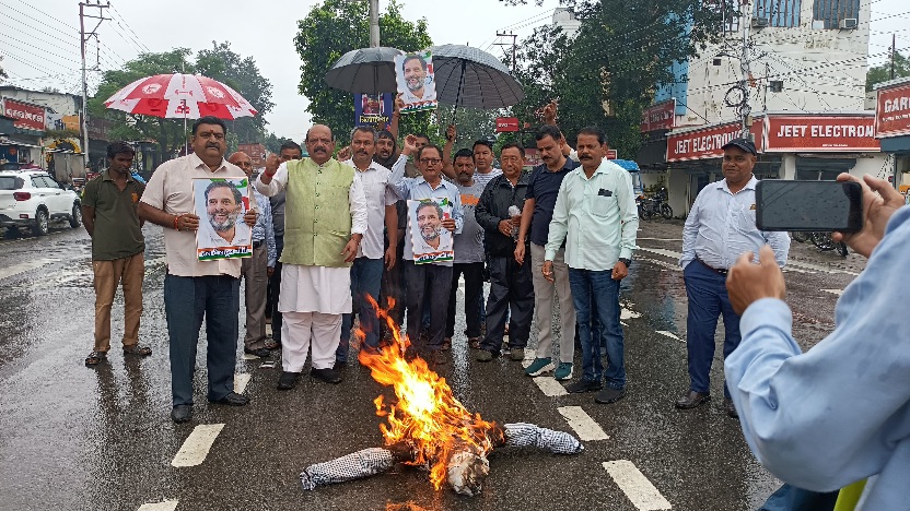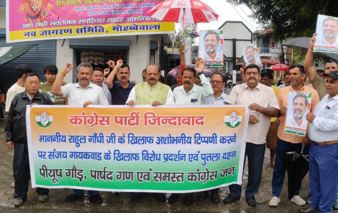देहरादून :- बुधवार को भारूवाला ग्रांट के अंतर्गत मोहब्बै वाला चौक पर ऑल इंडियन कांग्रेस संगठन के प्रदेश अध्यक्ष पीयूष गौड़ व पूर्व महानगर अध्यक्ष लालचंद शर्मा के नेतृत्व में राहुल गांधी के विरुद्ध हिंसात्मक बातें करने वाले शिवसेना(शिंदे) विधायक संजय गायकवाड के खिलाफ कांग्रेस कार्यकर्ताओं ने प्रदर्शन कर गायकवाड का पुतला फुंका।