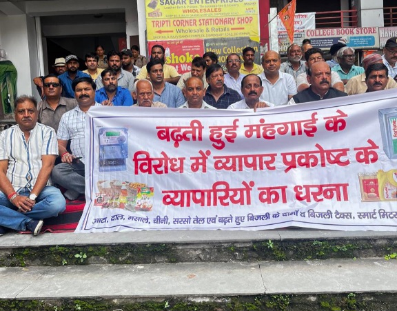 देहरादून :- शनिवार को व्यापार प्रकोष्ठ के व्यापारियों ने राजीव गांधी कांप्लेक्स में राजीव गांधी की मूर्ति के आगे महंगाई के विरोध में नारेबाजी कर धरना दिया। जिसमें उन्होंने कहा की सरकार खाद्य पदार्थों पर महंगाई बढ़ाती जा रही है। आटा, दाल,चीनी, चायपत्ती, मसाले, सरसों का तेल रिफाइंड इन सब चीजों के दाम आसमान छू रहे हैं।