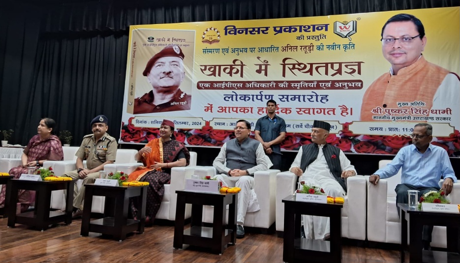 देहरादून :- शनिवार को मुख्यमंत्री पुष्कर सिंह धामी ने सर्वे चौक देहरादून स्थित आई.आर.डी.टी सभागार में उत्तराखण्ड के पूर्व पुलिस महानिदेशक अनिल रतूड़ी द्वारा लिखित पुस्तक ‘‘खाकी में स्थितप्रज्ञ’’ का विमोचन किया। अनिल रतूड़ी ने यह पुस्तक एक आईपीएस अधिकारी के रूप में अपने संस्मरण एवं अनुभव के आधार पर लिखी है।