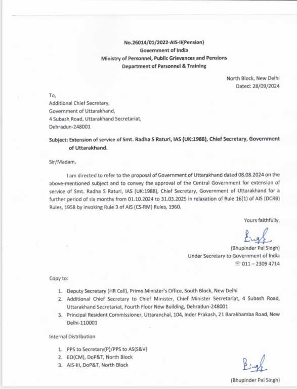 केंद्र सरकार के कार्मिक और प्रशिक्षण विभाग के अपर सचिव भूपेंद्र पाल सिंह की ओर से यह आदेश जारी किए गए हैं। राधा रतूड़ी1988 बैच की आईएएस हैं। नियमों में छूट देते हुए उन्हें यह विस्तार दिया गया है। उल्लेखनीय है कि राधा रतूड़ी को इससे पहले मार्च में छह माह का सेवा विस्तार दिया गया था। 30 सितंबर को उनका यह विस्तार खत्म हो रहा है।