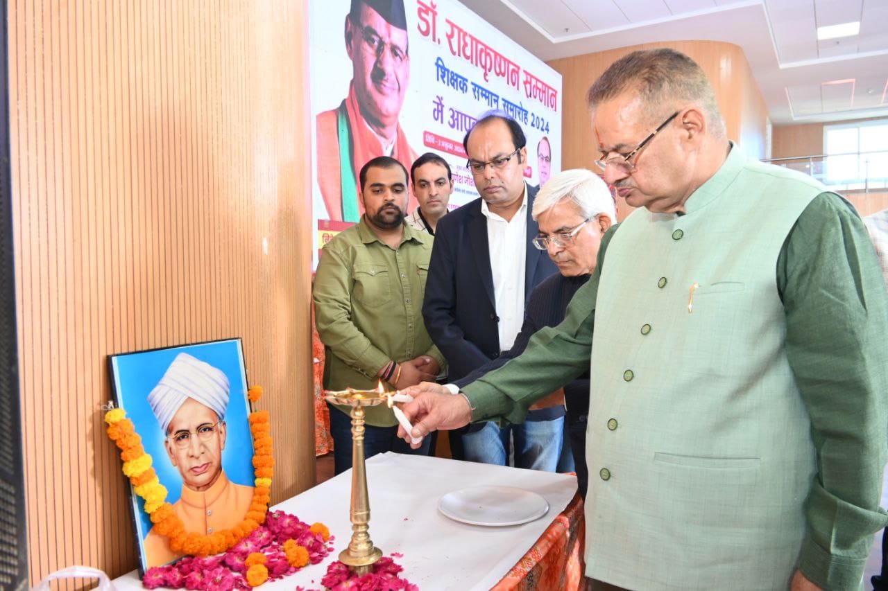 देहरादून/मसूरी :- कैबिनेट मंत्री गणेश जोशी ने बुधवार को टाउन हॉल मसूरी में मसूरी ट्रेडर्स एंड वेलफेयर एसोसिएशन द्वारा आयोजित डॉ. राधाकृष्णन शिक्षक सम्मान समारोह 2024 कार्यक्रम में बतौर मुख्य अतिथि प्रतिभाग किया। कार्यक्रम का शुभारंभ कैबिनेट मंत्री गणेश जोशी ने दीप प्रज्ज्वलित कर किया। इस दौरान कार्यक्रम में उपस्थित शिक्षकों को डॉ. राधाकृष्णन सम्मान से सम्मानित किया।