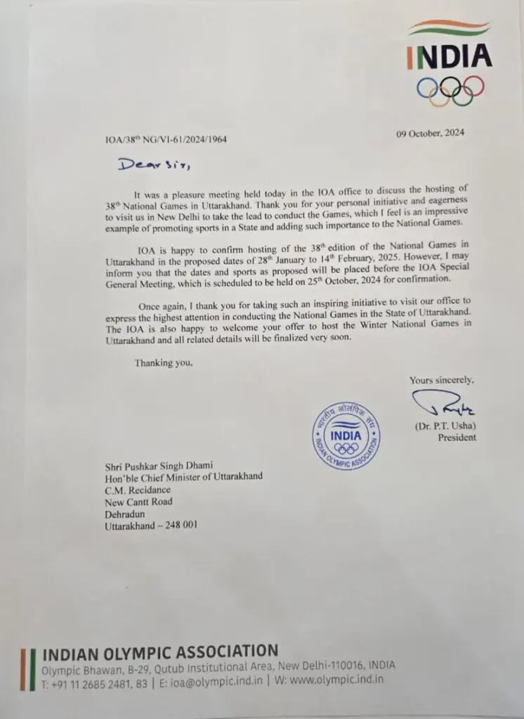 देहरादून :- 38वें राष्ट्रीय खेलों का आयोजन 28 जनवरी से 14 फरवरी 2025 के बीच किए जाने का ऐलान कर दिया गया है। इसे लेकर 25 अक्टूबर 2024 को प्रस्तावित भारतीय ओलंपिक संघ की आम सभा की बैठक में इसका पूरा कार्यक्रम जारी किया जायेगा। राष्ट्रीय खेलों के साथ ही विंटर नेशनल गेम का आयोजन भी उत्तराखण्ड में किया जायेगा।