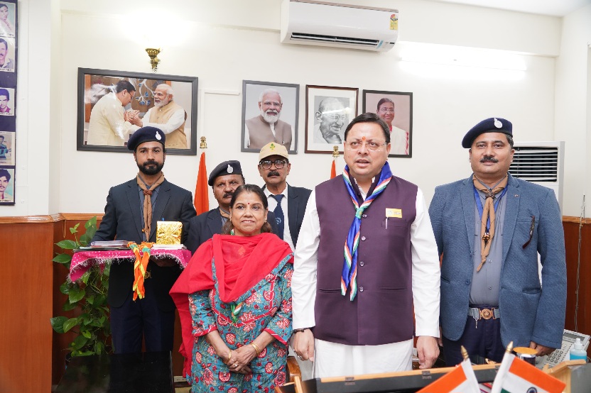 देहरादून :- भारत स्काउट एंड गाइड उत्तराखंड के द्वारा संगठन के 75 वें स्थापना दिवस के उपलक्ष्य में शुक्रवार को सचिवालय में मुख्यमंत्री पुष्कर सिंह धामी को फ्लैग स्टिकर लगाकर अलंकृत किया गया।