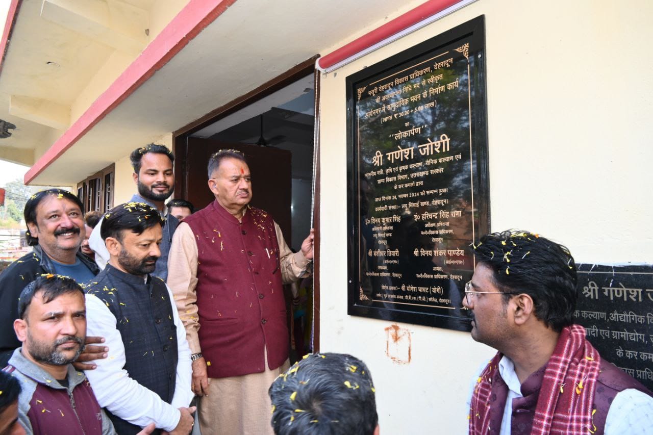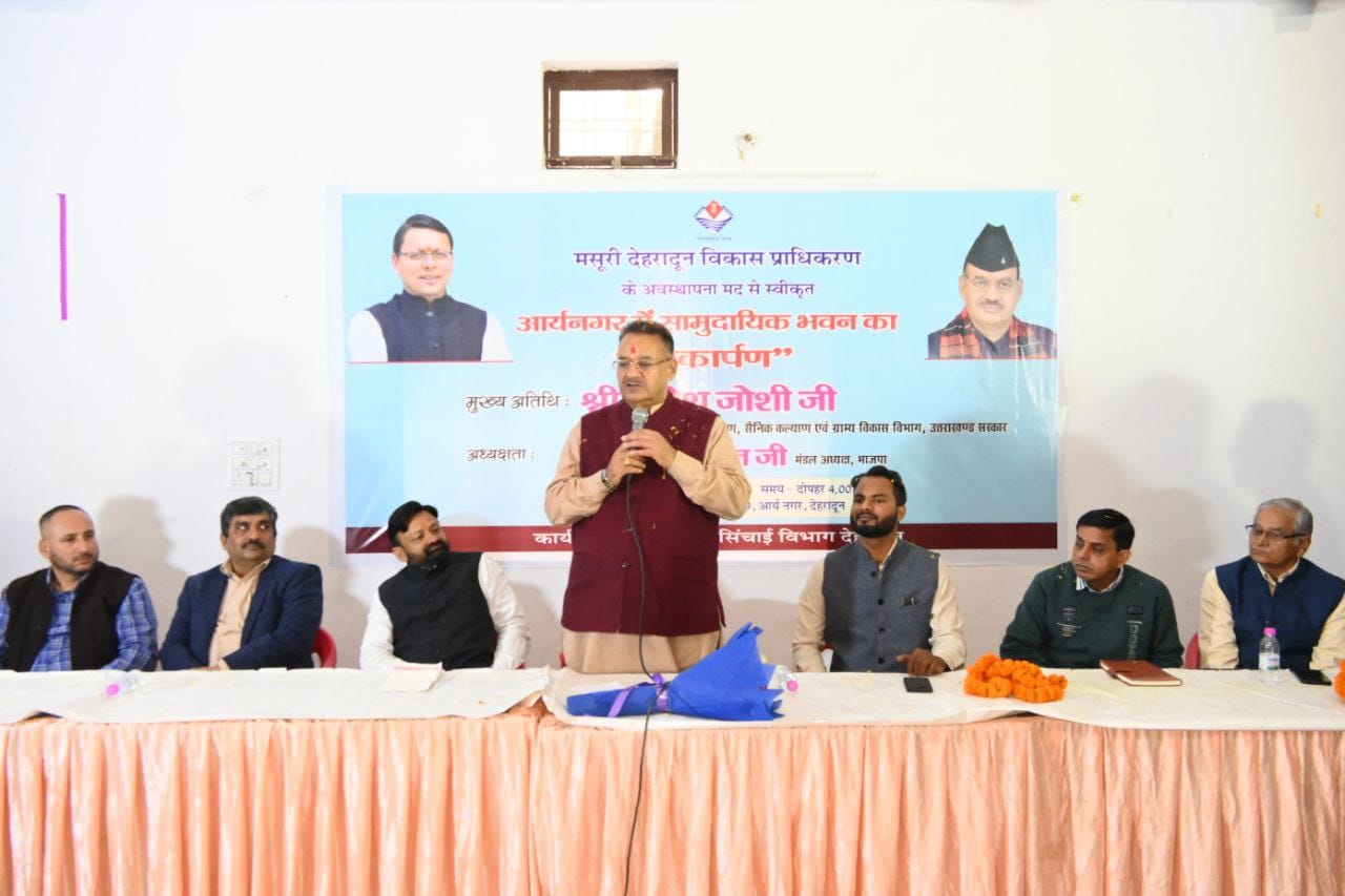 देहरादून :- कैबिनेट मंत्री गणेश जोशी ने रविवार को देहरादून के मसूरी विधानसभा क्षेत्र के अंतर्गत आर्यनगर में मसूरी देहरादून विकास प्राधिकरण देहरादून की अवस्थापना निधि मद से स्वीकृत ₹35 लाख की लागत से नव निर्मित सामुदायिक भवन लोकार्पण किया।