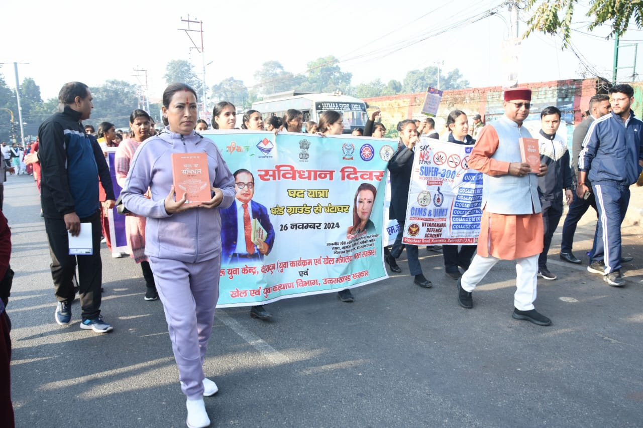 देहरादून :- उत्तराखण्ड सरकार में कैबिनेट मंत्री रेखा आर्या ने देहरादून के पवेलियन ग्राउंड से संविधान दिवस के अन्तर्गत पद यात्रा की। संविधान दिवस के अवसर पर पद यात्रा देहरादून के पवेलियन ग्राउंड से प्रारंभ होकर घंटा घर स्थित बाबा साहब भीम राव अंबेडकर पार्क पहुँची जहाँ मंत्री रेखा आर्या ने बाबा साहब की मूर्ति पर माल्यार्पण कर उनको श्रद्धांजलि अर्पित की।