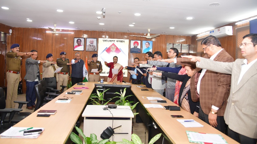 देहरादून :- मंगलवार को मुख्य सचिव श्रीमती राधा रतूड़ी ने संविधान दिवस के अवसर पर सचिवालय में अधिकारियों व कर्मचारियों के साथ संविधान की प्रस्तावना को दोहरा कर संविधान की शपथ दिलवाई।