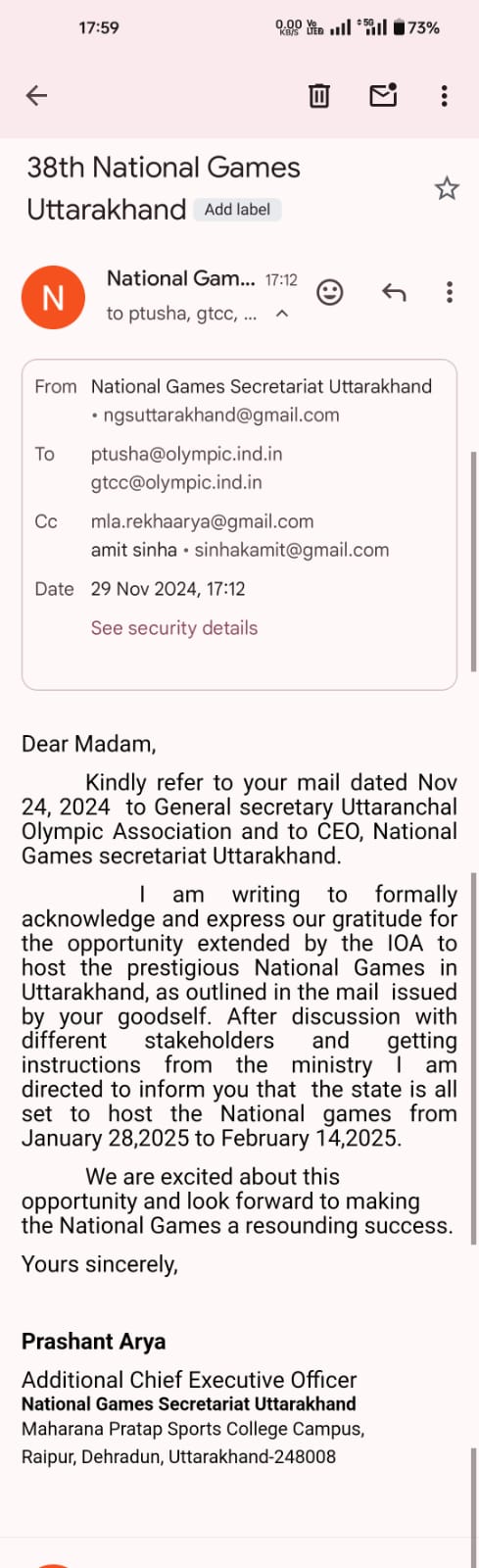 खेल मंत्री रेखा आर्या के निर्देशों के बाद, ACEO राष्ट्रीय खेल सचिवालय/ निदेशक खेल ने किया भारतीय ओलंपिक संघ को सूचित- प्रदेश 28 जनवरी 2025 से 14 फरवरी 2025 के बीच राष्ट्रीय खेल करवाने के लिए तैयार।