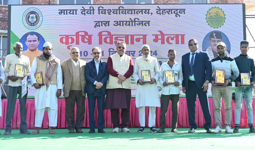 देहरादून :- प्रदेश के कृषि मंत्री गणेश जोशी ने मंगलवार को सेलाकुई स्थित माया ग्रुप ऑफ कालेजेस में दो दिवसीय कृषि विज्ञान मेले का रिबन काटकर शुभारंभ किया। इस अवसर पर कृषि मंत्री गणेश जोशी ने उत्कृष्ट कार्य करने वाले किसानों को भी सम्मानित किया। इस दौरान कृषि मंत्री गणेश जोशी ने विश्वविद्यालय परिसर के हर्बल उद्यान एवं प्रयोग केंद्र में तुलसी के पौधे का रोपण भी किया।