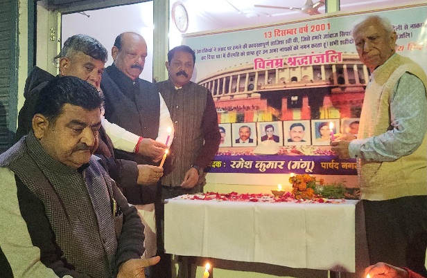 देहरादून :- 13 दिसंबर 2001 को आज ही के दिन देश की संसद पर हुए हमले की बरसी पर पूर्व महानगर अध्यक्ष लालचंद शर्मा, वार्ड 78 टर्नर रोड के निवर्तमान पार्षद रमेश कुमार मंगू ने शहीद वीर जवानों को नमन कर शहीद श्रद्धा सुमन अर्पित किए।