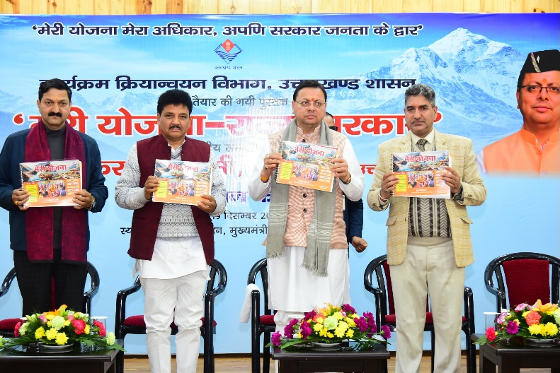 देहरादून :- मुख्यमंत्री पुष्कर सिंह धामी ने गुरूवार को मुख्यमंत्री कैम्प कार्यालय स्थित मुख्य सेवक सदन में कार्यक्रम क्रियान्वयन विभाग द्वारा प्रकाशित ’’मेरी योजना-राज्य सरकार’’ पुस्तक का विमोचन किया। मुख्यमंत्री ने कहा कि हमारा उद्देश्य जनता के लिए केवल योजनाएं बनाना नहीं है, बल्कि सभी योजनाओं का धरातल पर क्रियान्वयन सुनिश्चित करना भी है, जिन योजनाओं का हम शिलान्यास करते हैं उनके लोकार्पण का भी हमारा प्रयास रहता है, ताकि योजनाओं का लाभ प्रत्येक पात्र व्यक्ति तक पहुंच सके। इस उद्देश्य को प्राप्त करने के लिए, इस पुस्तक को तैयार किया गया है, जिसमें सरकार की विभिन्न जनकल्याणकारी योजनाओं और सेवाओं को सरल और व्यावहारिक भाषा में प्रकाशित किया गया है।