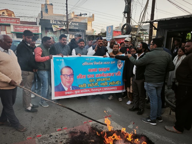 देहरादून :- संसद में केंद्रीय गृहमंत्री अमित शाह द्वारा संविधान निर्माता बाबा साहब भीमराव अंबेडकर जी के बारे में अनर्गल बयान बाजी करने से नाराज कांग्रेस पार्टी के कार्यकर्ताओं ने सेवला कला वार्ड नंबर 86 मे अंबेडकर भवन में एकत्रित हुए एवं जुलूस निकालकर केंद्रीय मंत्री अमित शाह का पुतला दहन किया गया।