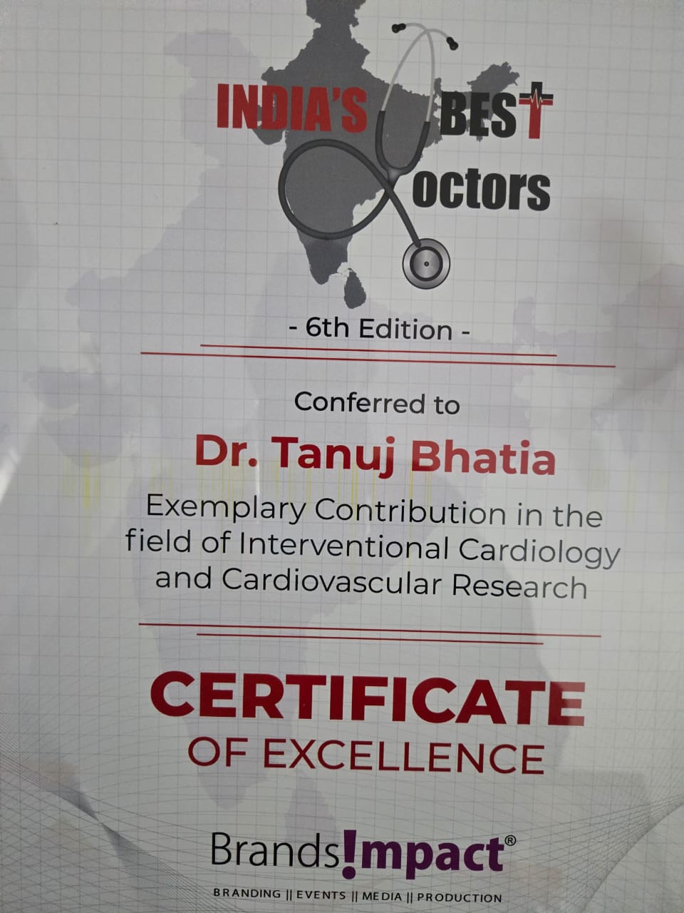 ब्रांड इम्पैक्ट की ओर से आयोजित समारोह में देश के नामचीन 7 डाॅक्टरों को अलग अलग क्षत्रों में उल्लेखनीय योगदान के लिए चुना गया। काॅर्डियोलाॅजी के क्षेत्र में उल्लेखनीय योगदान के लिए उन्हें इण्डियाज़ बैस्ट डाॅक्टर्स अवार्ड से नवाजा गया। दिल्ली के विवांता बाय ताज होटल में आयोजित भव्य समारोह में देश के विभिन्न राज्यों से आए डॉक्टरों एवम् गणमान्य हस्तियों ने अवार्ड समरोह कार्यक्रम में शिरकत की। बालीवुड अभिनेत्री वाणी कपूर ने समारोह में डाॅ तनुज भाटिया को अवार्ड देकर सम्मानित किया। कार्यक्रम में उपस्थित डाॅक्टरों एवम् अन्य गणमान्य व्यक्तियों ने अक्यूट हार्ट अटैक के दौरान एविस प्रोटोकाल के महत्व से जुड़े कई सवाल पूछे, डाॅ तनुज भाटिया ने उन सभी सवालों के जवाब दिए और उनकी जिज्ञासाओं को शांत किया।