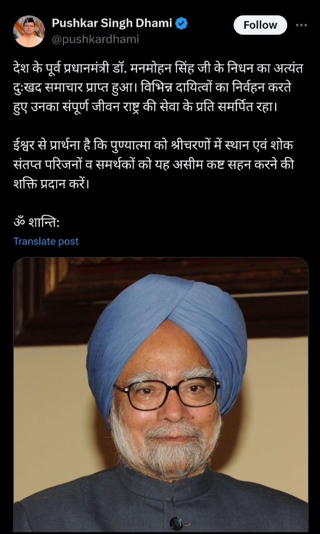 देहरादून :- मुख्यमंत्री पुष्कर सिंह धामी ने देश के पूर्व प्रधानमंत्री डॉ. मनमोहन सिंह जी के निधन पर गहरा शोक व्यक्त किया है। अपने शोक संदेश में मुख्यमंत्री ने कहा कि विभिन्न दायित्वों का निर्वहन करते हुए स्वर्गीय मनमोहन सिंह जी का संपूर्ण जीवन राष्ट्र की सेवा के प्रति समर्पित रहा।