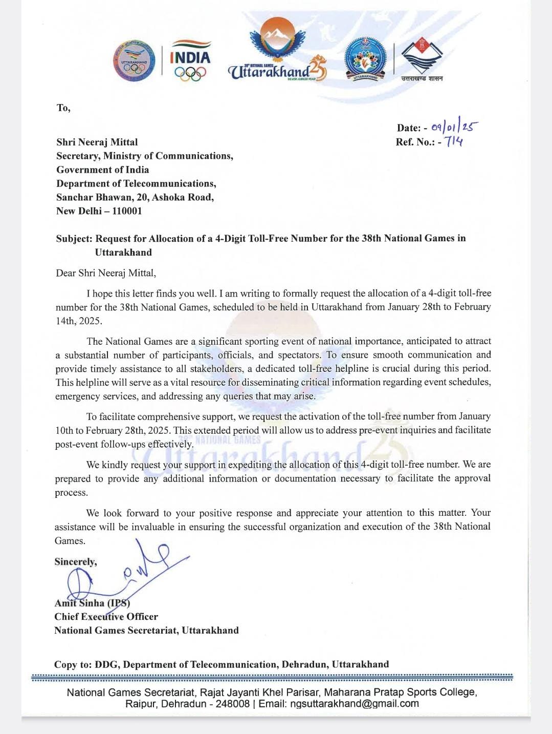 अब राष्ट्रीय खेल सचिवालय के मुख्य कार्यकारी अधिकारी अमित सिन्हा ने संचार सचिव नीरज मित्तल को पत्र प्रेषित किया हैै। राष्ट्रीय खेल सचिवालय उम्मीद कर रहा है कि बहुत जल्द संचार मंत्रालय के स्तर पर टोल फ्री नंबर आवंटित कर दिया जाएगा।