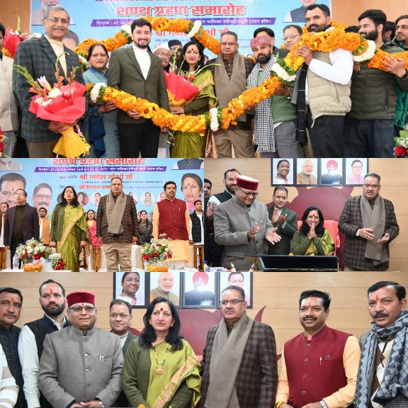 देहरादून/मसूरी :- कैबिनेट मंत्री गणेश जोशी ने आज मसूरी टाऊन हाल में नगर पालिका परिषद के नवनिर्वाचित अध्यक्ष मीरा सकलानी एवं सभासदगणों का शपथ ग्रहण समारोह में प्रतिभाग किया गया। इस ऐतिहासिक अवसर पर बीजेपी के प्रदेश महामंत्री (संगठन) अजेय कुमार और विधायक राजपुर खजान दास ने भी अपनी उपस्थिति दर्ज कराई। मसूरी के नगर पालिका टाउन हॉल में आयोजित शपथ ग्रहण समारोह भव्य रूप से संपन्न हुआ। कार्यक्रम में बड़ी संख्या में क्षेत्रवासी उपस्थित रहे। कैबिनेट मंत्री गणेश जोशी ने नव निर्वाचित अध्यक्ष मीरा सकलानी को पदभार ग्रहण करने पर भी बधाई एवं शुभकामनाएं दी।