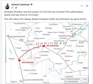 देहरादून :- देवबंद-रुड़की नई रेलवे लाइन परियोजना की 29.55 किलोमीटर लंबाई को रेल संरक्षा आयुक्त (सीआरएस) की मंजूरी मिल गई है। इस खंड पर हाल ही में 122 किलोमीटर प्रति घंटे की रफ्तार से सफल स्पीड ट्रायल किया गया। इस नई लाइन के चालू होने से दिल्ली और देहरादून के बीच रेलवे की दूरी लगभग 40 किलोमीटर कम हो जाएगी, जिससे यात्रा समय में उल्लेखनीय कमी आएगी।