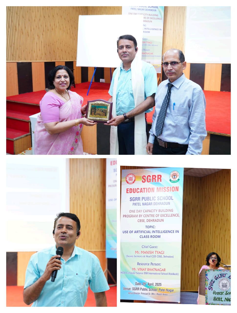 देहरादून :- श्री गुरु राम राय पब्लिक स्कूल पटेल नगर ने दिनांक 29 अप्रैल, 2025 को सीओई, सीबीएसई, देहरादून क्षेत्र द्वारा आयोजित एक दिवसीय क्षमता निर्माण कार्यक्रम की मेजबानी की। कार्यशाला का विषय “कक्षाओं में एआई का उपयोग” था। श्री मनीष त्यागी, उप सचिव और प्रमुख सीओई, सीबीएसई देहरादून कार्यक्रम के मुख्य अतिथि थे। श्री गुरु राम राय पब्लिक स्कूल पटेल नगर की प्रधानाचार्य डॉ. (श्रीमती) राजेश अरोड़ा ने मुख्य अतिथि का भावपूर्व स्वागत किया और स्वागत भाषण दिया। श्री विनय भटनागर, विभागाध्यक्ष, कंप्यूटर विज्ञान, डीएसबी इंटरनेशनल स्कूल, ऋषिकेश कार्यशाला के रिसोर्स पर्सन थे।