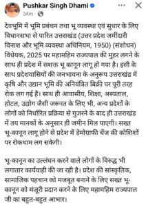 देहरादून :- देवभूमि में भूमि प्रबंधन तथा भू व्यवस्था एवं सुधार के लिए विधानसभा से पारित उत्तराखंड (उत्तर प्रदेश जमींदारी विनाश और भूमि व्यवस्था अधिनियम, 1950) (संशोधन) विधेयक, 2025 पर महामहिम राज्यपाल की मुहर लगने के साथ ही प्रदेश में सशक्त भू कानून लागू हो गया है। इसी के साथ प्रदेशवासियों की जनभावना के अनुरूप उत्तराखंड में कृषि और उद्यान भूमि की अनियंत्रित बिक्री पर पूरी तरह रोक लग गई है। साथ ही आवासीय, शिक्षा, अस्पताल, होटल, उद्योग जैसी जरूरत के लिए भी, अन्य प्रदेशों के लोगों को निर्धारित कड़ी प्रक्रिया से गुजरने के बाद ही उत्तराखंड में तय मानकों के अनुसार ही जमीन खरीद पाएंगे। सख्त भू कानून लागू होने से प्रदेश में डेमोग्राफी चेंज की कोशिशों पर रोकथाम लग सकेगी। प्रदेश की सांस्कृतिक, सामाजिक पहचान को मजबूत बनाने के लिए सख्त भू- कानून को मंजूरी प्रदान करने के लिए महामहिम राज्यपाल जी का बहुत बहुत आभार।