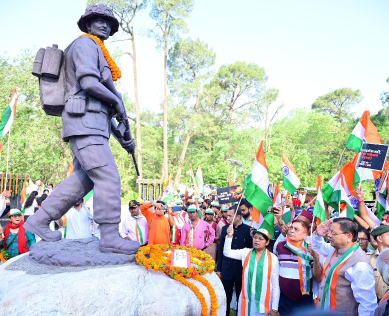 देहरादून :- मुख्यमंत्री पुष्कर सिंह धामी के नेतृत्व में बुधवार को शौर्य स्थल चीड़बाग से गांधी पार्क तक भव्य “तिरंगा शौर्य सम्मान यात्रा” का आयोजन किया गया। यह यात्रा हाल ही में भारतीय सशस्त्र बलों द्वारा सफलतापूर्वक चलाए गए “ऑपरेशन सिंदूर” की ऐतिहासिक विजय को समर्पित रही। हजारों की संख्या में आमजन, पूर्व सैनिक, युवा वर्ग एवं मातृशक्ति ने तिरंगे के साथ पद यात्रा में भाग लिया। मुख्यमंत्री ने इस अवसर पर शौर्य स्थल पर पुष्प चक्र अर्पित कर शहीद जवानों को श्रद्धांजलि भी दी।