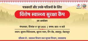 देहरादून :- उत्तराखण्ड में पत्रकारों और उनके परिजनों के स्वास्थ्य की चिंता को लेकर राज्य सरकार बेहद गम्भीर है। मुख्यमंत्री पुष्कर सिंह धामी के निर्देश पर, मंगलवार 17 जून को सूचना निदेशालय, रिंग रोड, देहरादून में एक विशेष नि:शुल्क स्वास्थ्य सुरक्षा कैम्प का आयोजन किया जा रहा है।यह कैम्प स्वास्थ्य विभाग व सूचना विभाग के संयुक्त प्रयास से प्रातः 11 बजे से शुरू होगा।