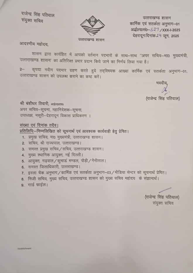 देहरादून :- उत्तराखंड शासन से बड़ी प्रशासनिक खबर सामने आई है। राज्य सरकार ने वरिष्ठ आईएएस अधिकारी बंशीधर तिवारी को सीएम पुष्कर सिंह धामी का अपर सचिव नियुक्त किया है। शासन ने इस संबंध में आधिकारिक आदेश जारी कर दिए हैं, जिससे मुख्यमंत्री कार्यालय की कार्यप्रणाली और अधिक सशक्त होने की उम्मीद है। बंशीधर तिवारी को मिली यह नई जिम्मेदारी सरकार के कामकाज और प्रशासनिक समन्वय में उनकी भूमिका को और महत्वपूर्ण बना देगी। वे इससे पहले भी शासन में कई महत्वपूर्ण पदों पर कार्य कर चुके हैं और नीति-निर्माण तथा योजना क्रियान्वयन में दक्ष अधिकारी माने जाते हैं। सरकार के इस निर्णय को मुख्यमंत्री कार्यालय की कार्यप्रणाली को और अधिक प्रभावशाली बनाने की दिशा में अहम कदम माना जा रहा है।