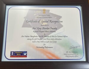 देहरादून/नई दिल्ली :- नई दिल्ली में 23 से 25 जून तक आयोजित क्षेत्रीय पासपोर्ट अधिकारियों के सम्मेलन के दौरान देहरादून के क्षेत्रीय पासपोर्ट अधिकारी विजय शंकर पांडेय को देशभर में सर्वश्रेष्ठ पासपोर्ट अधिकारी के सम्मान से नवाज़ा गया। यह राष्ट्रीय स्तर का पुरस्कार उन्हें 24 जून को पासपोर्ट सेवा दिवस के अवसर पर प्रदान किया गया। सम्मान समारोह में उन्हें यह पुरस्कार विदेश राज्य मंत्री पाबित्रा मार्गेरिटा द्वारा प्रदान किया गया। विजय शंकर पांडेय की कार्यकुशलता, समयबद्ध सेवाएं, पारदर्शिता और जनसुविधा केंद्रित कार्यशैली को देखते हुए उन्हें यह प्रतिष्ठित सम्मान दिया गया है। यह उपलब्धि न केवल उत्तराखंड, बल्कि पूरे देश के पासपोर्ट सेवा नेटवर्क के लिए प्रेरणा का स्रोत है। कार्यक्रम में विदेश मंत्रालय के वरिष्ठ अधिकारियों के अलावा देशभर से आए क्षेत्रीय पासपोर्ट अधिकारियों ने भाग लिया। इस सम्मान के लिए देहरादून आरपीओ के चयन को पासपोर्ट सेवाओं की गुणवत्ता और दक्षता में उत्कृष्टता का प्रतीक माना जा रहा है।