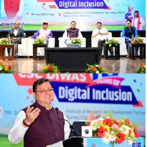 देहरादून :- मुख्यमंत्री पुष्कर सिंह धामी ने शुक्रवार को आई.आर.डी.टी ऑडिटोरियम, सर्वे चौक, देहरादून में सी.एस.सी (कॉमन सर्विस सेंटर) दिवस-2025 के अवसर पर आयोजित कार्यक्रम में प्रतिभाग किया। इस दौरान उन्होंने सीएससी के क्षेत्र में उत्कृष्ट कार्य करने वाले लोगों को CSC वी.एल.ई पुरस्कार से भी सम्मानित किया।