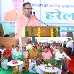 देहरादून :- उत्तराखण्ड की पर्यावरण एवं सांस्कृतिक परंपरा के प्रतीक हरेला पर्व की पूर्व संध्या पर आज देहरादून के न्यू कैंट रोड़ में आयोजित फलदार पौध वितरण कार्यक्रम में प्रदेश के कृषि एवं कृषक कल्याण मंत्री गणेश जोशी ने प्रतिभाग किया। यह कार्यक्रम उद्यान विभाग द्वारा आयोजित किया गया, जिसमें आम, लीची, अमरूद, नींबू, अनार, कटहल जैसी विभिन्न फल प्रजातियों के पौधों का निःशुल्क वितरण किया गया।