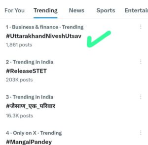 देहरादून/रुद्रपुर :- प्रदेश में ₹01 लाख करोड़ रुपये की ग्राउंडिंग पूरी होने पर रुद्रपुर, ऊधम सिंह नगर में उत्तराखंड निवेश उत्सव मनाया गया तो सोशल मीडिया पर इसकी धूम मच उठी। सोशल मीडिया साइट X (पूर्व में ट्विटर) पर #UttarakhandNiveshUtsav दिनभर देशभर में नंबर-1 पर ट्रेंड करता रहा।