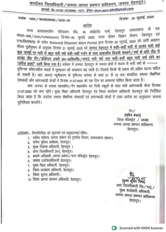 देहरादून :- भारत मौसम विज्ञान विभाग (आईएमडी) और राष्ट्रीय आपदा प्रबंधन प्राधिकरण (एनडीएमए) द्वारा जारी ‘ऑरेंज अलर्ट’ के मद्देनजर जिलाधिकारी सविन बंसल ने जनपद देहरादून में 21 जुलाई 2025 को कक्षा 1 से 12 तक के सभी शैक्षणिक संस्थानों और आंगनबाड़ी केंद्रों में एक दिन का अवकाश घोषित किया है। यह निर्णय भारी से अत्यंत भारी बारिश, आकाशीय बिजली, और भूस्खलन की संभावना को देखते हुए आपदा न्यूनीकरण के दृष्टिगत लिया गया है।