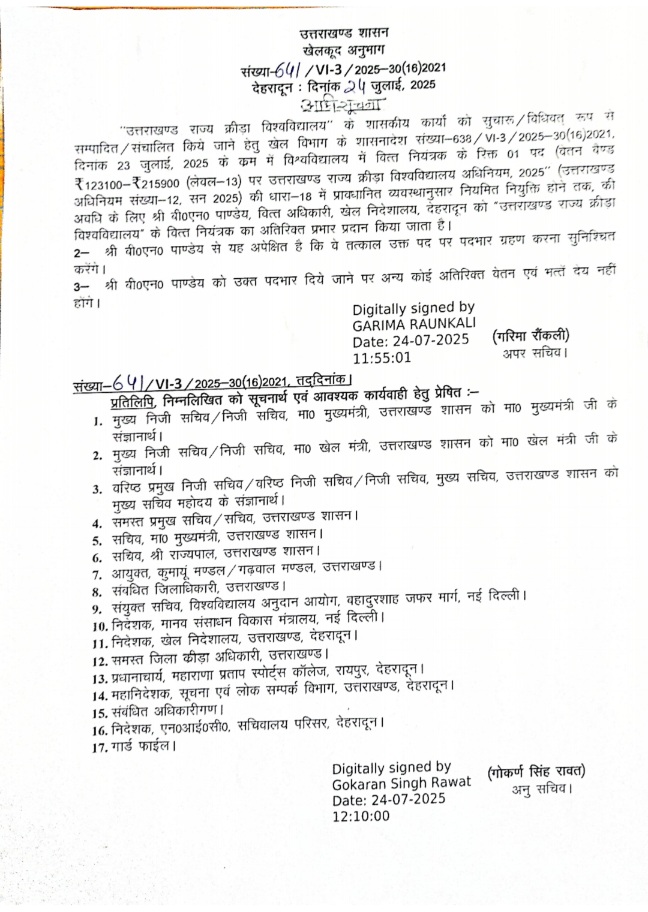 फिलहाल विशेष प्रमुख खेल सचिव अमित सिन्हा कुलपति जबकि खेल निदेशक आशीष चौहान कुल सचिव पद की जिम्मेदारी संभालेंगे। इनके अलावा खेल निदेशालय के वित्त अधिकारी वीएन पांडे को विश्वविद्यालय के वित्त नियंत्रक का कार्यभार सौंपा गया है।