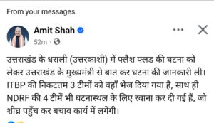 देहरादून :- उत्तराखंड के उत्तरकाशी जिले के धराली गांव में बादल फटने की दुर्भाग्यपूर्ण घटना पर केंद्रीय गृह मंत्री अमित शाह ने गहरा दुःख प्रकट किया है। उन्होंने इस आपदा में जन-धन की हानि पर संवेदना व्यक्त की है, और प्रभावित परिवारों के प्रति सहानुभूति जताई है।
