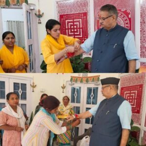 देहरादून :- रक्षाबंधन के पावन अवसर पर आज हाथीबड़कला स्थित शासकीय आवास पर कन्या गुरुकुल महाविद्यालय देहरादून की छात्राओं एवं पर्यावरण मित्र महिलाओं ने कैबिनेट मंत्री गणेश जोशी की कलाई पर रक्षा सूत्र बांधकर उनके दीर्घायु एवं सुख-समृद्धि की कामना की। इस अवसर पर कैबिनेट मंत्री गणेश जोशी ने प्रदेशवासियों को रक्षा बंधन की बधाई एवं शुभकामनाएं दी। इस दौरान मंत्री जोशी ने सभी बहनों को उपहार भेंट कर सभी का आशीर्वाद लेते हुए कहा कि “रक्षाबंधन केवल भाई-बहन के स्नेह का पर्व ही नहीं, बल्कि यह हमारे रिश्तों में विश्वास, प्रेम और सुरक्षा के संकल्प का प्रतीक है।