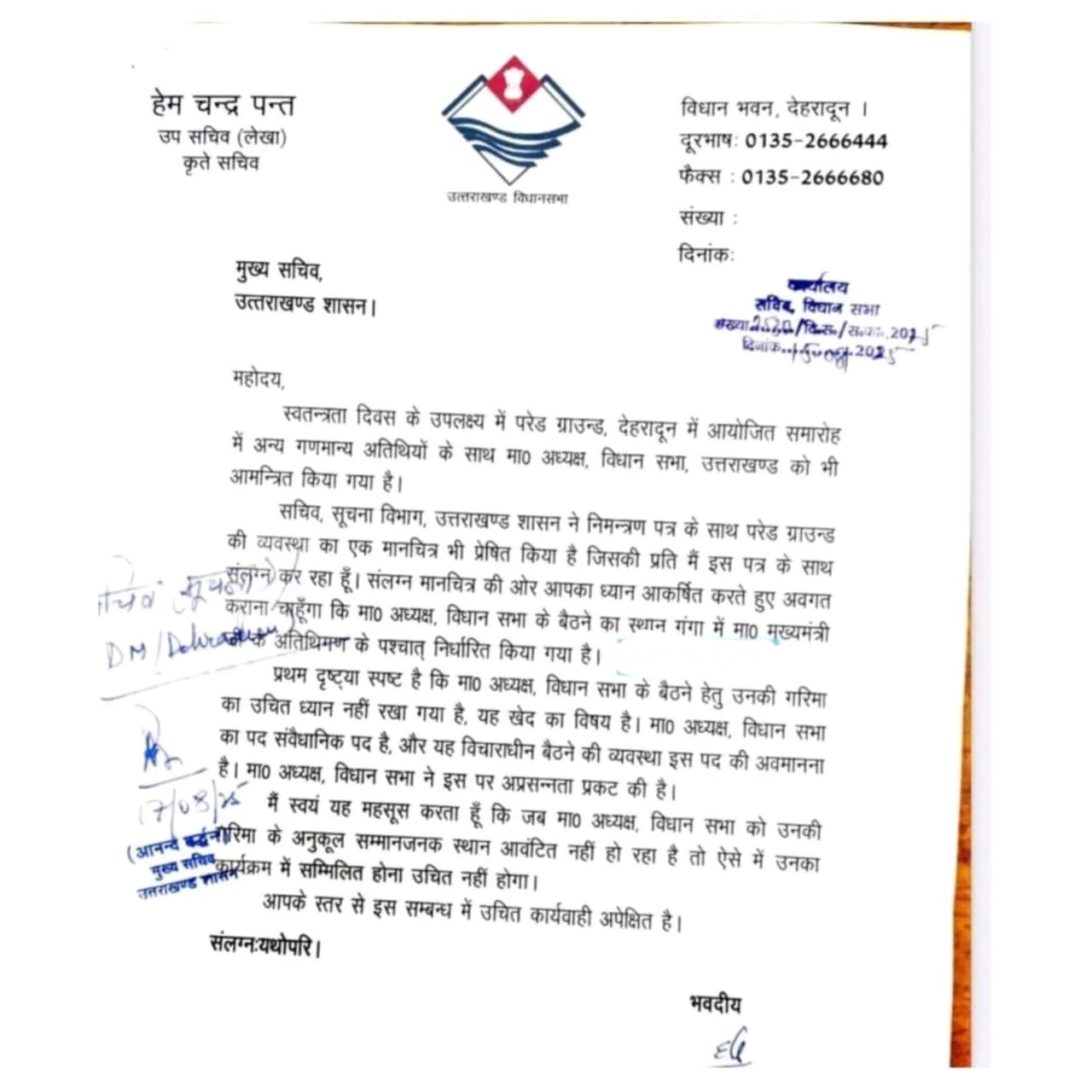 सचिव, सूचना विभाग, उत्तराखण्ड शासन ने निमन्त्रण पत्र के साथ परेड ग्राउन्ड की व्यवस्था का एक मानचित्र भी प्रेषित किया है जिसकी प्रति में इस पत्र के साथ संलग्न मानचित्र की ओर आपका ध्यान आकर्षित करते हुए अवगत DM अतिथिगण के पश्चात् निर्धारित किया गया है। कराना चाहूँगा कि मा० अध्यक्ष, विधान सभा के बैठने का स्थान गंगा में मा० मुख्यमंत्री प्रथम दृष्ट्या स्पष्ट है कि मा० अध्यक्ष, विधान सभा के बैठने हेतु उनकी गरिमा का उचित ध्यान नहीं रखा गया है, यह खेद का विषय है। मा० अध्यक्ष, विधान सभा का पद संवैधानिक पद है, और यह विचाराधीन बैठने की व्यवस्था इस पद की अवमानना है। मा० अध्यक्ष, विधान सभा ने इस पर अप्रसन्नता प्रकट की है।