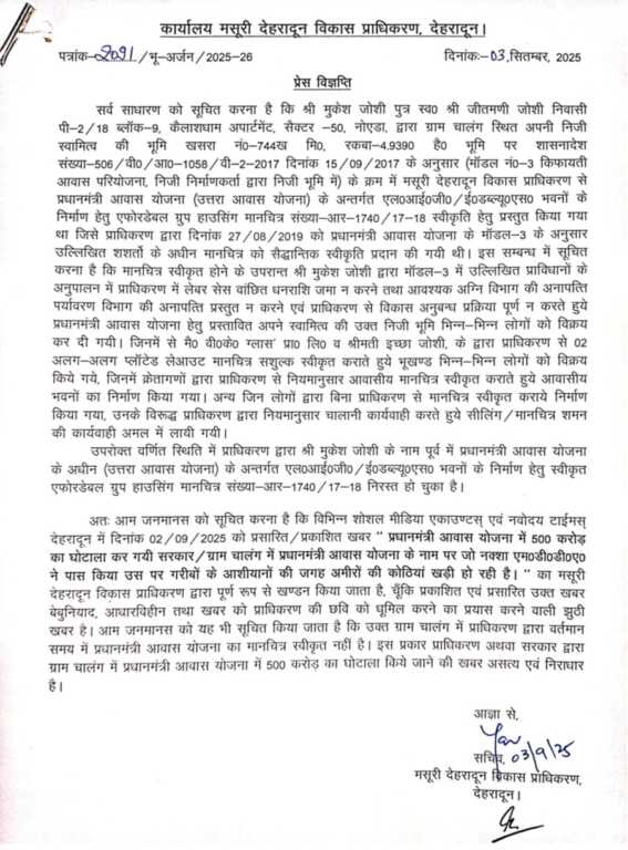 अतः आम जनमानस को सूचित करना है कि विभिन्न शोशल मीडिया एकाउण्टस् एवं नवोदय टाईमस् देहरादून में दिनांक 02/09/2025 को प्रसारित / प्रकाशित खबर” प्रधानमंत्री आवास योजना में 500 करोड़ का घोटाला कर गयी सरकार / ग्राम चालंग में प्रधानमंत्री आवास योजना के नाम पर जो नक्शा एम०डी०डी०ए० ने पास किया उस पर गरीबों के आशीयानों की जगह अमीरों की कोठियां खड़ी हो रही है।” का मसूरी देहरादून विकास प्राधिकरण द्वारा पूर्ण रूप से खण्डन किया जाता है, चूँकि प्रकाशित एवं प्रसारित उक्त खबर बेबुनियाद, आधारविहीन तथा खबर को प्राधिकरण की छवि को धूमिल करने का प्रयास करने वाली झुठी खबर है। आम जनमानस को यह भी सूचित किया जाता है कि उक्त ग्राम चालंग में प्राधिकरण द्वारा वर्तमान समय में प्रधानमंत्री आवास योजना का मानचित्र स्वीकृत नहीं है। इस प्रकार प्राधिकरण अथवा सरकार द्वारा ग्राम चालंग में प्रधानमंत्री आवास योजना में 500 करोड़ का घोटाला किये जाने की खबर असत्य एवं निराधार है।
