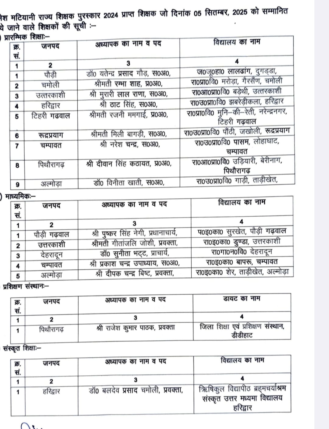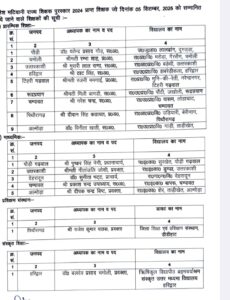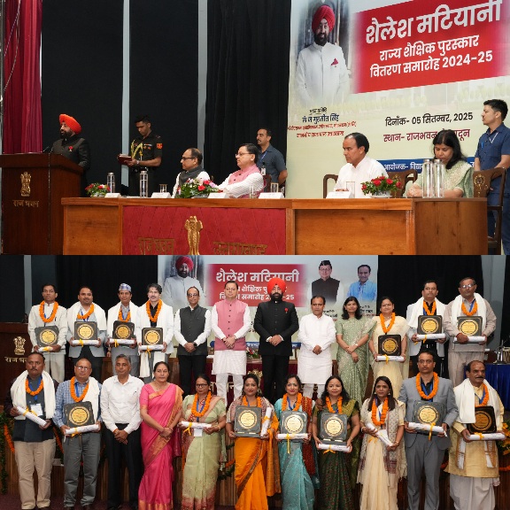 देहरादून :- शिक्षक दिवस के अवसर पर शुक्रवार को राजभवन में ‘‘शैलेश मटियानी राज्य शैक्षिक पुरस्कार’’ सम्मान समारोह आयोजित हुआ। समारोह में राज्यपाल लेफ्टिनेंट जनरल गुरमीत सिंह (से नि), मुख्यमंत्री पुष्कर सिंह धामी और शिक्षा मंत्री डॉ. धन सिंह रावत ने वर्ष-2024 में शैलेश मटियानी राज्य शैक्षिक पुरस्कारों के लिए चयनित 16 शिक्षक एवं शिक्षिकाओं को सम्मानित किया। वर्ष-2024 में चयनित 09 प्रारम्भिक शिक्षक, 05 माध्यमिक शिक्षक, 01 शिक्षक प्रशिक्षक एवं 01 संस्कृत शिक्षक को यह सम्मान प्रदान किया गया है।