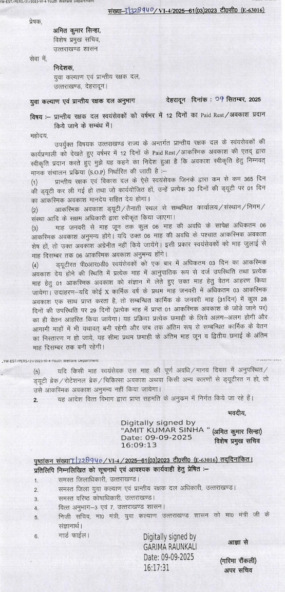 देहरादून :- प्रदेश में प्रांतीय रक्षक दल स्वयंसेवकों को अब साल भर में कुल 12 दिन का मानदेय सहित अवकाश मिल सकेगा । इस बारे में मंगलवार को आदेश जारी कर दिया गया है।
