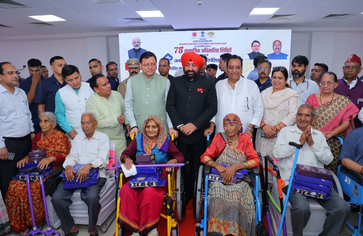 राजधानी देहरादून के दून मेडिकल कॉलेज में आयोजित सेवा पर्व के उपलक्ष में 75 सामाजिक अधिकारिता शिविरों में प्रधानमंत्री नरेन्द्र मोदी जी के सेवा ही संकल्प, राष्ट्र प्रथम ही प्रेरणा को लेकर मुख्यमंत्री पुष्कर सिंह धामी ने भारतीय कृत्रिम अंग निर्माण निगम कानपुर के सहयोग से जनपद देहरादून में माननीय मुख्यमंत्री पुष्कर सिंह धामी द्वारा 360 वरिष्ठ नागरिकों को 2402 सहायक उपकरणों का निशुल्क वितरण किया। कार्यक्रम के दौरान मुख्यमंत्री पुष्कर सिंह धामी ने 60 वर्ष से अधिक आयु वाले वृद्धजनों से सीधा संवाद किया। साथ ही उनकी समस्याओं को भी जाना।