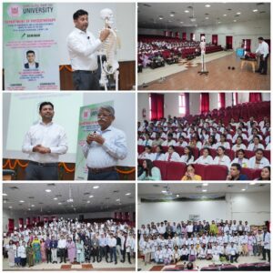 उन्होंने अपने वक्तव्य में बताया कि किस प्रकार फिजियोथेरेपी द्वारा कंधे का दर्द (फ्रोजन शोल्डर, रोटेटर कफ इंजरी), गर्दन का दर्द, सर्वाइकल स्पोंडलाइटिस, मसल स्पास्म, कमर दर्द, लंबर पेन, साइटिका तथा घुटने की समस्याएं जैसी जटिल बीमारियों का प्रभारी उपचार सम्भव है। उन्होंने लाइव डेमो के माध्यम से मैनुअल थेरेपी, मोबिलाइजेशन तकनीक और स्ट्रेचिंग एक्सरसाइसाइज की बारीकियों को भी समझाया। उन्होंने अपना अनुभव सांझा करते हुए कहा कि नियमित फिजियोथेरेपी न केवल दर्द को कम करती है, बल्कि रोगी को दीर्घकालीन आराम और सक्रिय जीवनशैली की ओर अग्रसर करती है। प्रो. डाॅ. नीरज कुमार ने धन्यवाद ज्ञापित किया।