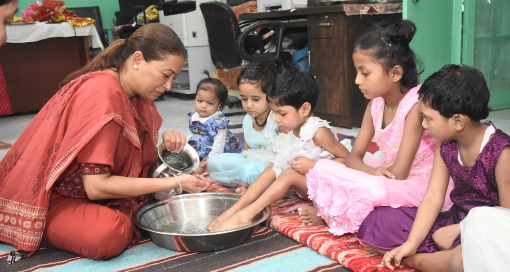 देहरादून :- केदारपुरम स्थित राजकीय बालिका निकेतन में महिला सशक्तिकरण एवं बाल विकास मंत्री रेखा आर्या ने नवरात्रि के पावन पर्व पर कन्याओं का कंजक पूजन किया। उन्होंने नन्हीं कन्याओं के चरण पखारकर उनका पूजन किया और उनके साथ बैठकर भोजन ग्रहण किया।