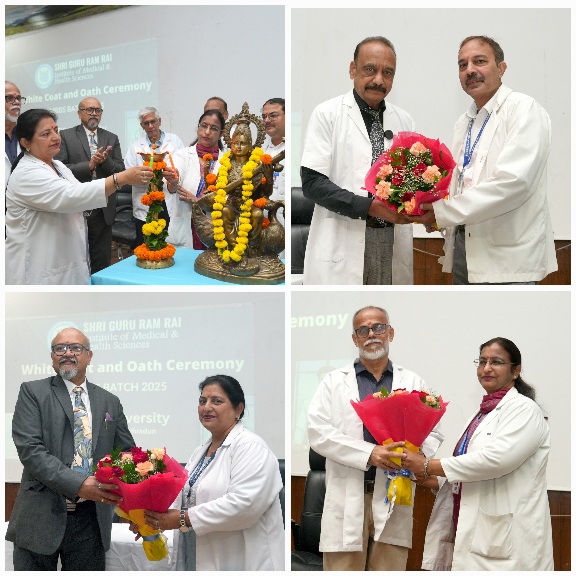 इस अवसर पर डॉ. प्रथ्थपन के के पिल्लई, डॉ. मनोज कुमार गुप्ता, डॉ. अशोक नायक, डॉ. अनिल मलिक व विभिन्न विभागाध्यक्षो ने नव आगुंतक (फ्रैशर) छात्र-छात्राओं को अपने हाथों से वाईट कोट पहनाकर वाईट कोट सैरेमनी को सम्पन्न किया। इस अवसर पर कार्यक्रम के मुख्य अतिथि प्रो.डॉ. प्रथप्पन के पिल्लई ने अपने सम्बोधन में फ्रैशर छात्र-छात्राओं से कहा कि वे आने वाले भविष्य के डॉक्टर हैं। उन्होने कहा कि आने वाले भविष्य मे समाज की स्वास्थ्य सेवाएं उन्हीं के द्वारा सभाली जाएंगी। उन्होने कहा कि इस जिम्मेदारी को समझ कर आज उन्होने अपने जीवन मे पहली बार मैडिकल प्रोफेशनल की पहचान वाईट कोट पहना है। उन्होंने कहा कि इस वाईट कोट से जुडे महत्व, सम्मान व उत्तरदायित्व को समझकर वे अनुशासित व आर्दश छात्र-छात्राएं बनकर मैडिकल की पढाई सम्पन्न करेगें व आगे जा कर आर्दश डॉक्टर बनकर समाज की सेवा करेगें। डॉ. मनोज कुमार गुप्ता ने अपने संबोधन में कहा कि वाईट कोट सैरेमनी में वाईट कोट पहनते साथ समाज की प्रति महत्वपूर्ण उत्तरदायित्व दिया जाता है। उन्होने कहा कि न केवल मेडिकल शिक्षा व बल्कि मरिजो के साथ समुचित व्यवहार करना भी सिखाया जाता है। डॉ. अशोक नायक ने अपने संबोधन में डॉ. अशोक नायक ने सभी नव आगुंतक छात्र-छात्राओं का स्वागत करते हुए कहा कि श्री गुरु राम राय इस्टीट्यूट ऑफ मेडिकल एण्ड हैल्थ साइंसेज में मेडिकल की शिक्षा के साथ-साथ मानवता की सेवा करना भी सिखाया जाता है। इसके उपरांत अकेडमिक इन्चार्ज डॉ.निधि जैन द्वारा नव आगुंतक (फ्रैशर) छात्र-छात्राओं को चरक शपथ भी दिलवाई गई। इस अवसर पर छात्र-छात्राओं कोे सम्बोधित करते हुए डॉ. पुनीत ओहरी ने कहा कि वाईट कोट सैरेमनी नेशनल मेडिकल कमीशन (एनएमसी) द्वारा आवश्यक दिशा निर्देश है इसका पालन प्रतिवर्ष किया जाता है। उन्होने कहा कि यह शपथ ले कर मैडिकल छात्र-छात्राएं अपने जीवन की एक नये अध्याय की शुरूआत कर रहे है। उनके द्वारा चरक शपथ के माध्यम से मैडिकल छात्र-छात्राओं को मैडिकल प्रोफेशन के नैतिक,मौलिक व मानवीय उत्तरदायित्व को समझाया गया। उन्होने कहा कि आज चरक शपथ लेकर मैडिकल छात्र-छात्राओं ने अपने प्रोफेशन के माध्यम से मरीजो व समाज की पूरी ईमानदारी, मेहनत व लगन के साथ सेवा करने का संकल्प लिया है जिसे वे सदैव निभाएंगे।