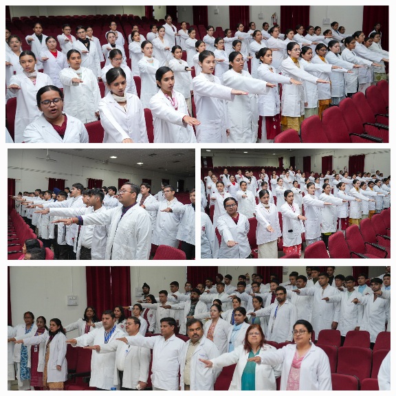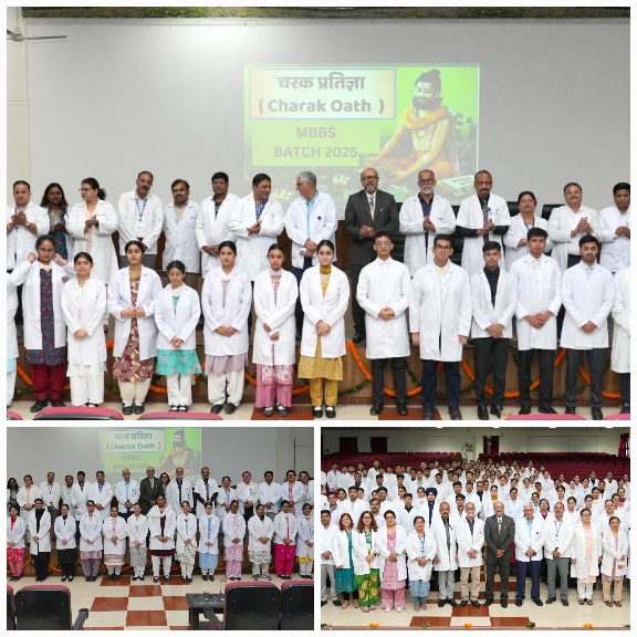 इस वाईट कोट सैरेमनी व चरक शपथ मे 134 नव आगुंतक (फ्रैशर) छात्र-छात्राओं ने बडे़ उत्साह के साथ प्रतिभाग किया। कार्यक्रम मे मंच संचालन डॉ. वाणी शर्मा द्वारा किया गया।