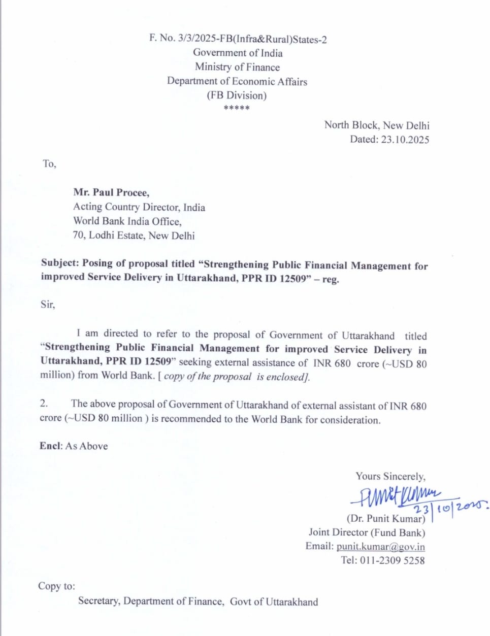 भारत सरकार के वित्त मंत्रालय द्वारा इस प्रस्ताव को विश्व बैंक भारत कार्यालय, नई दिल्ली के कार्यवाहक कंट्री डायरेक्टर पॉल प्रूसी को औपचारिक रूप से प्रेषित किया गया है। पत्र में यह स्पष्ट किया गया है कि उत्तराखंड सरकार के इस प्रस्ताव की प्रति संलग्न करते हुए इसे विचार एवं स्वीकृति हेतु अनुशंसित किया जा रहा है।