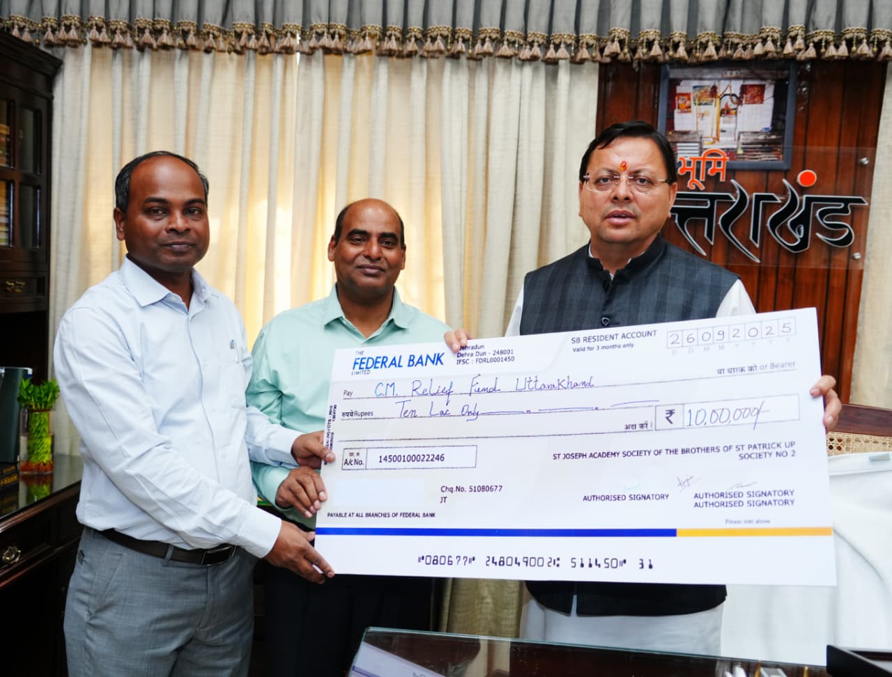 देहरादून :- मुख्यमंत्री पुष्कर सिंह धामी से शनिवार को मुख्यमंत्री कैंप कार्यालय में सेंट जोसेफ अकादमी, देहरादून के स्कूल प्रबंधन ने मुलाकात कर आपदा पुनर्निर्माण के कार्यों के लिए मुख्यमंत्री राहत कोष में ₹10 लाख की धनराशि प्रदान की।