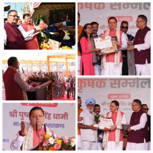 देहरादून/पंतनगर :- मुख्यमंत्री पुष्कर सिंह धामी ने शुक्रवार को राज्य के रजत जयंती उत्सव के अवसर पर पंतनगर कृषि एवं प्रौद्योगिकी विश्वविद्यालय में वृहद कृषक सम्मेलन का शुभारम्भ किया। कार्यक्रम में कृषि, उद्यान, दुग्ध, मत्स्य, सहकारिता के प्रगतिशील कृषक व लखपति दीदीयों को मुख्यमंत्री द्वारा प्रतीक चिन्ह, प्रशस्ति पत्र व अंगवस्त्र भेटकर सम्मानित किया गया। इस अवसर पर कृषि मंत्री गणेश जोशी भी उपस्थित रहे।