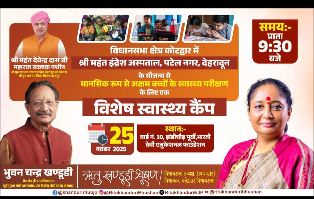 देहरादून/कोटद्वार :- झंडीचौड़ व आसपास के क्षेत्र में बढ़ती मानसिक एवं विकासात्मक समस्याओं से जूझ रहे बच्चों की स्थिति को समझने हेतु श्री गुरु राम राय विश्वविद्यालय एवं श्री महंत इन्दिरेश अस्पताल, पटेल नगर, देहरादून के संयुक्त तत्वावधान में झंडीचौड़ कोटद्वार में विशेष स्वास्थ्य शिविर आयोजित किया गया। क्षेत्र के स्थानीय प्रतिनिधियों द्वारा विधानसभा अध्यक्ष श्रीमती ऋतु भूषण खंडूड़ी के संज्ञान में यह बात लाई गई थी कि इस इलाके में बडी संख्या में बच्चे मानसिक रूप से अक्षम या विकास से संबंधित समस्याओं का सामना कर रहे हैं।